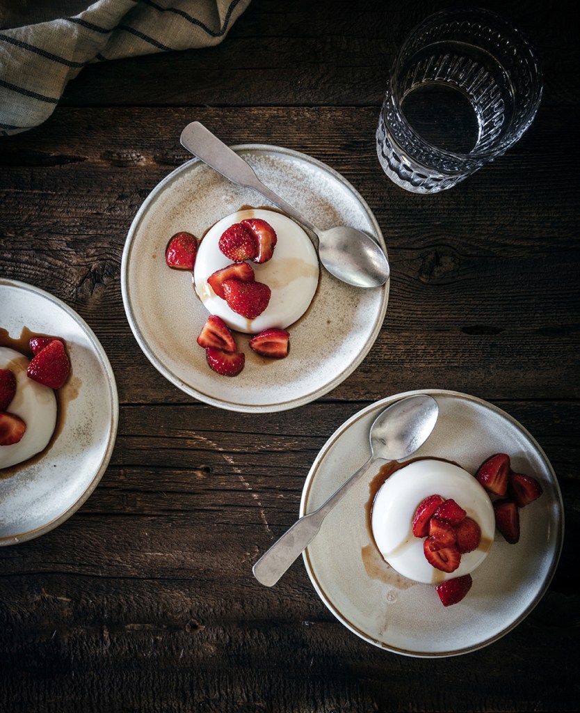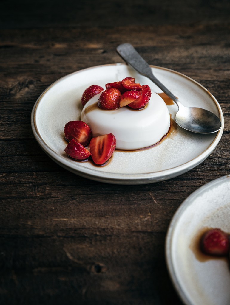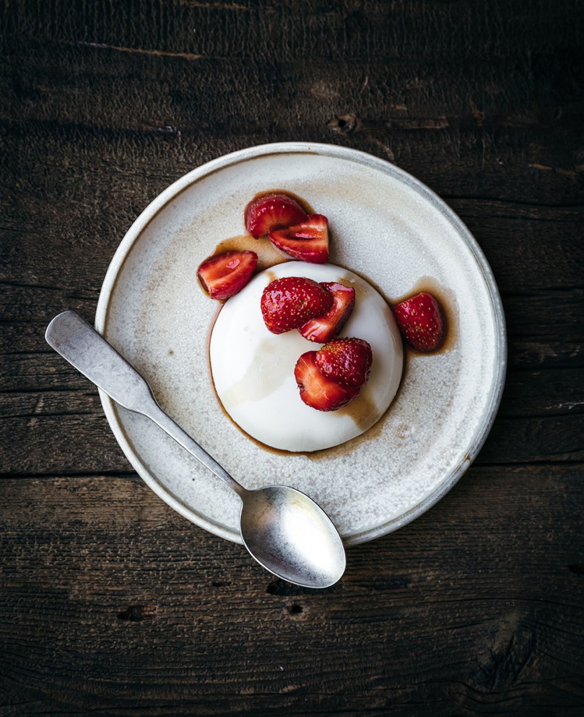 It is incredibly creamy and has a nice contrast of flavors with the sweet panna cotta strawberries and tart balsamic vinegar. I would recommend using canned coconut cream or all full fat coconut milk – instead of the separated coconut cream from a can of coconut milk. The reason is that some times the fat content in the separated coconut cream is too high, producing a much stiffer panna cotta.